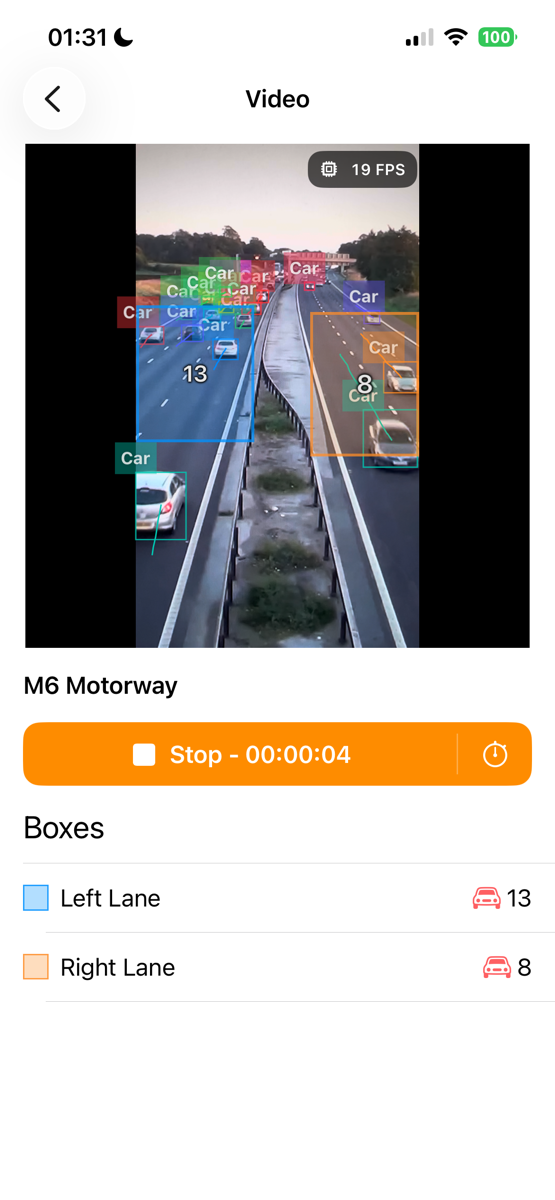 Wenn du auf **Analyse starten** drückst, wird das Video in Echtzeit abgespielt, sodass du den Fortschritt live sehen kannst, während Fahrzeuge und Personen gezählt werden. Sobald das Video beendet ist, erhältst du eine vollständige Zusammenfassung. Wenn du die Analyse jederzeit stoppen möchtest, drücke einfach auf **Stopp**, um die Ergebnisse bis zu diesem Zeitpunkt anzusehen.