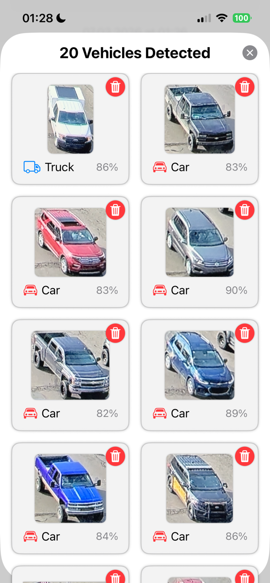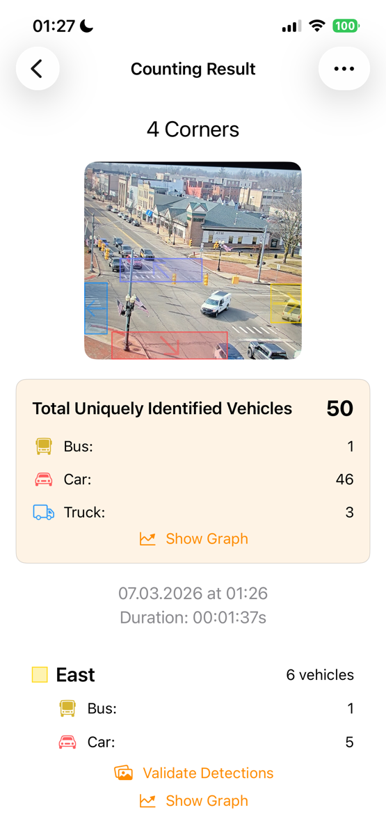 Nachdem du eine Sitzung aufgezeichnet hast, kannst du die Erkennungen validieren, indem du auf die Schaltfläche **Erkennungen validieren** tippst, die sich unter den Details jedes Erkennungsfeldes befindet. Dadurch kannst du ein Bild jedes erkannten Fahrzeugs oder jeder Person sehen, zusammen mit ihrer Klassifizierung (wie Auto, Lkw oder Person) und dem Vertrauensprozentsatz der Erkennung.
