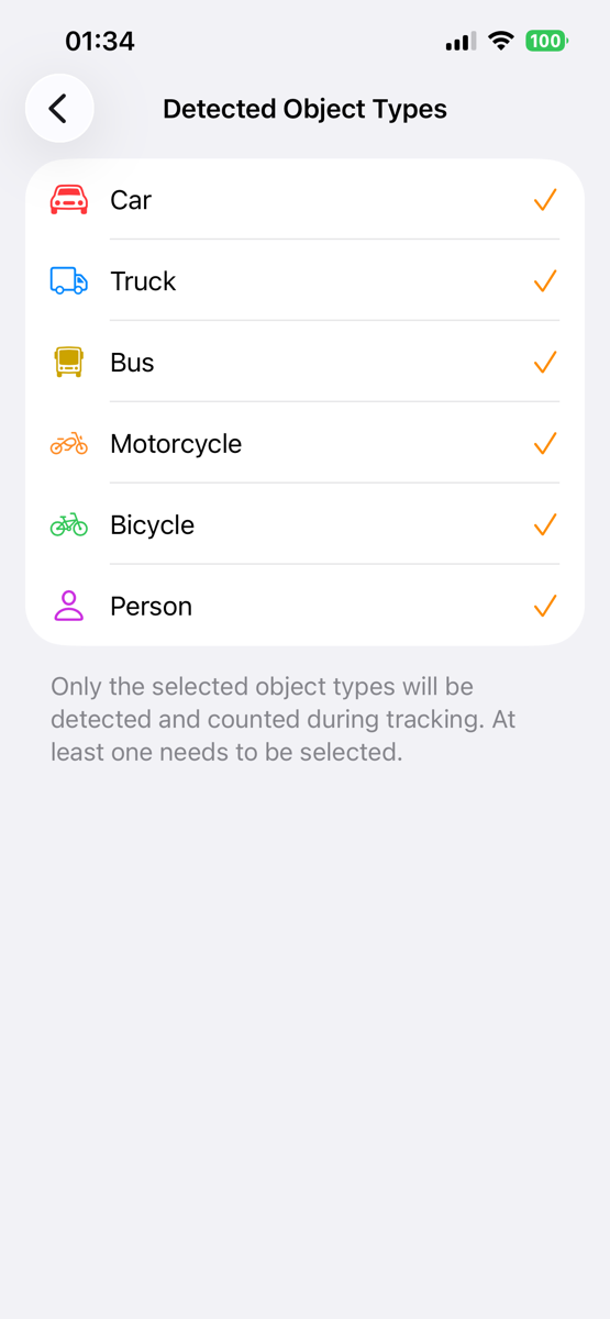 To count only specific vehicles, go to the settings and select the **Detected Object Types** option. From there, you can choose the vehicle types you want to include in your count.