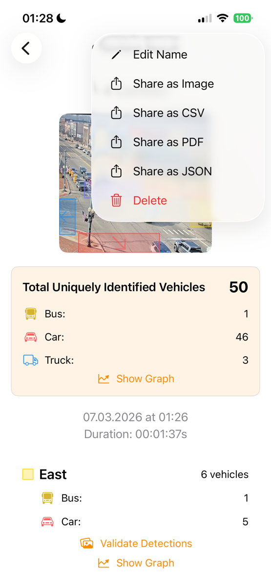Next, you’ll see the session’s start date and duration, followed by detailed results for each detection box. If you enabled the “Save Object Images” option in the app settings, you can verify the counted objects with corresponding images. You can also remove incorrectly counted items by tapping the trash icon.